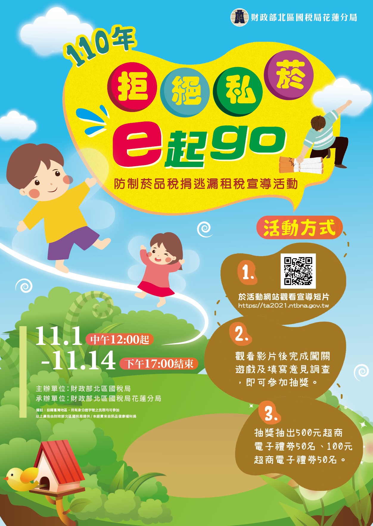 財政部北區國稅局花蓮分局為傳達正確的菸品稅捐常識及拒絕私劣菸等觀念辦理網路闖關活動,鼓勵民眾踴躍參加.
